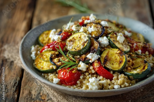 Grilled zucchini and tomatoes with barley and feta cheese. A healthy and delicious summer meal.