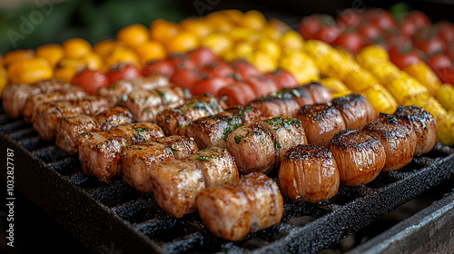 Grilling a colorful assortment of meats and vegetables at a summer barbecue gathering in a backyard setting during late afternoon
