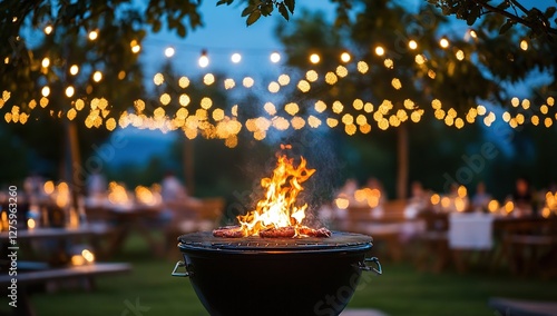 Grilling Sausages and Steaks at Nighttime Outdoor Party with Festive Lights