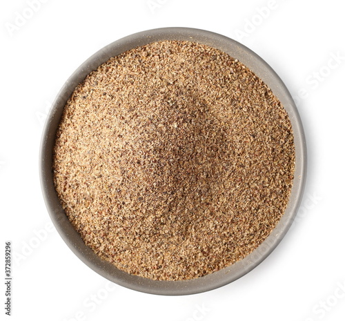 Ground carob powder (Ceratonia siliqua) in porcelain bowl isolated on white background, top view