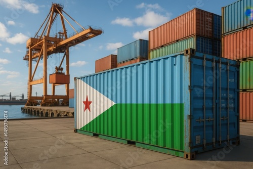 Grounded shipping container decorated with the Djiboutian flag. Suitable for international relations, port operations, or global commerce visuals.