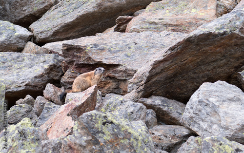 Groundhog on stones in free nature at autumn in warm light