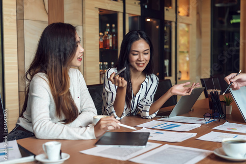 Group Asian businesswoman are enjoying success working together brainstorm analytical ideas using graph tablet documents at the office