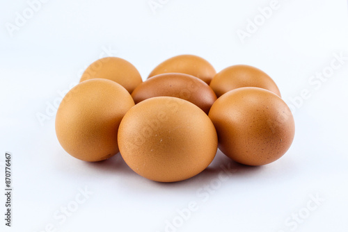 group of seven raw asian chicken eggs on white isolated background