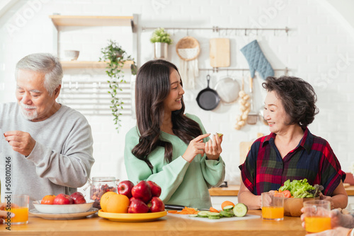 Group of asian elder senior friends at dinner party at home, senior friend preparing salad and fruit juice with her daughter with smiling cheerful moment conversation with elder friend laugh smile