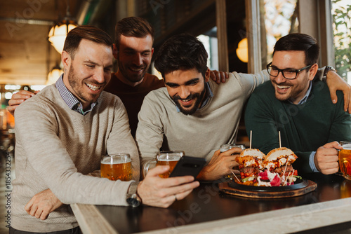 Group of diverse friends sitting in a restaurant, drinking beer and talking