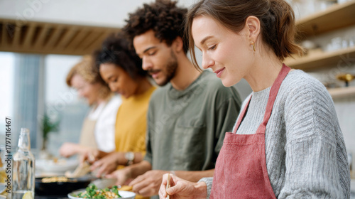 Group of diverse young adults cooking together in a modern kitchen preparing healthy meals with focus and collaboration