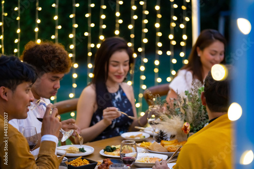 Group of diversity Asian millennial people friends enjoy outdoor garden dinner party eating food and drinking wine with talking together. Reunion friendship meeting celebration and night life concept.