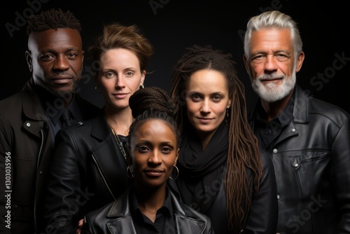 Group of five diverse individuals with unique styles posing against a dark background in a professional studio setting