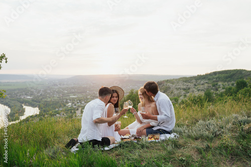Group of four young friends enjoying a healthy picnic sitting outdoors on the hill drinking white wine and eating a variety of fresh fruit.