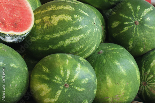 Group of freshness green melon from organic farm selling at retail opened market, homemade garden tree in the field backgrounds
