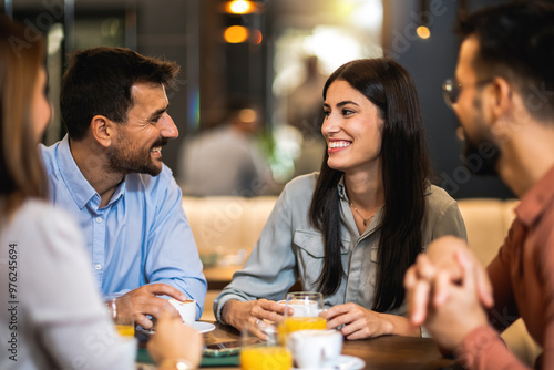 Group of friends met at the cafe. Drinking coffee and orange juice. Girl and guy are talking while the other friends are listening to them.