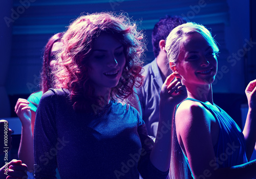 group of happy friends dancing in night club