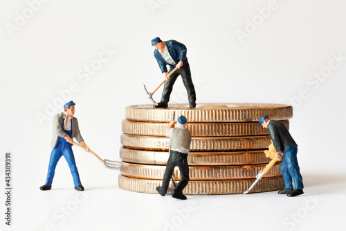 Group of miner figurines with equipment working on stack of bitcoins. Cryptocurrency, blockchain or trading concept.