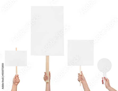Group of people holding blank signs on white background, closeup. Mockup for design