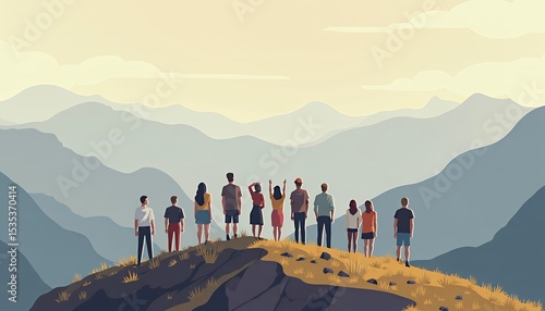 Group of People Standing on Mountain Peak Overlooking Valley in Nature