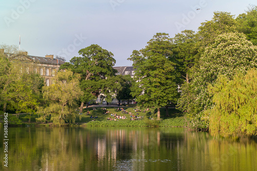 group of picnickers in a public park in summer in Copenhagen, picnic next to a lake
