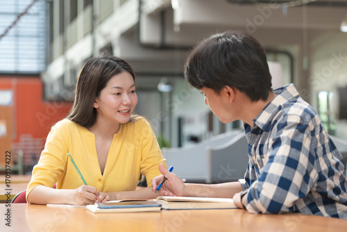 Group of students studying together in library. Two Asian students learning and discussing in a library at the university.