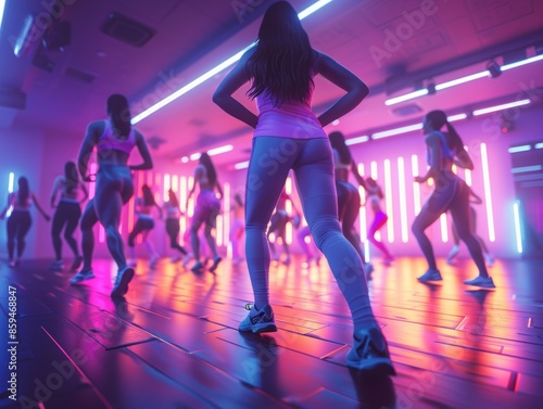 Group of women exercising in a neon-lit fitness studio, dancing and working out with vibrant lights and energetic atmosphere.