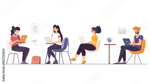 Group of young people working on laptops in a modern workspace, white isolate background.