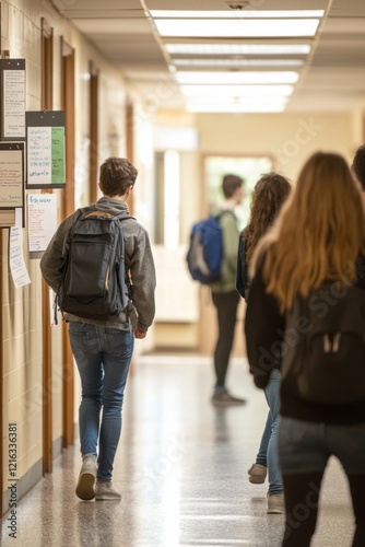 Groups of students exchanging stories and laughing in a hallway filled with posters