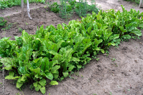 Growing beet seedlings. Young, sprouted beet growing in open ground flat bed into the garden. Growing vegetables at home. Concept of healthy and eco food and gardening.