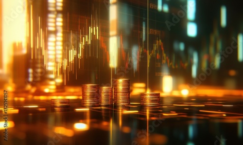 Growing coin stacks, golden bars and candlestick forex chart on blurry background.