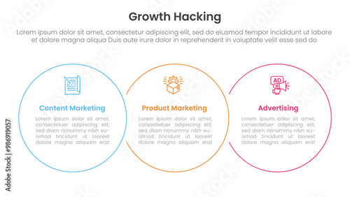 growth hacking infographic 3 point with big circle outline union horizontal for slide presentation