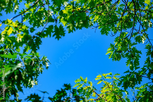 Grüne Blätter vor blauem Himmel