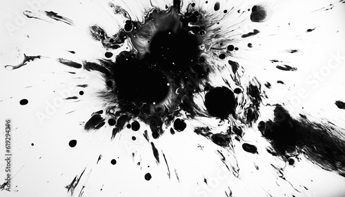 Grunge splash. Black ink. Dark fluid drops stain blotch spreading on white abstract background illustration with free space.
