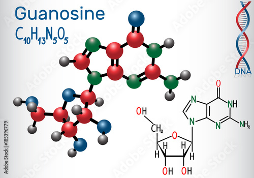 Guanosine - purine nucleoside molecule, is important part of GMP, GDP, cGMP , GTP, RNA, DNA. Structural chemical formula and molecule model