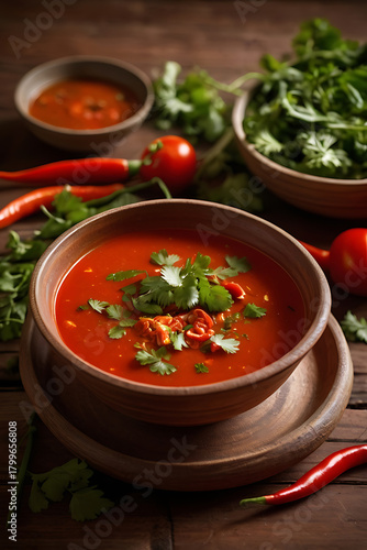 Guatemalan Kak’ik — vibrant red turkey soup with achiote, cilantro, tomatoes, and chilies. Guatemala traditional authentic food. Central American cuisine