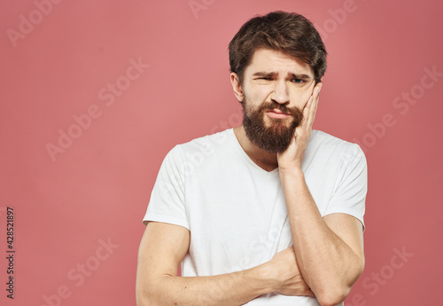 Guy touches his face with his hands on a pink background cropped view