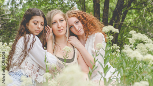 gypsy women in white flowered meadow in forest