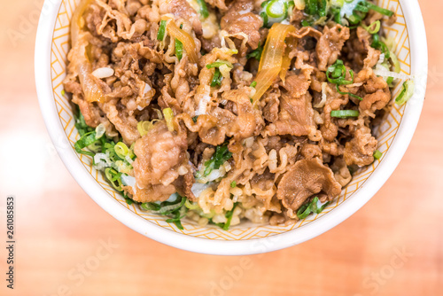 Gyudon or strip beefs with a lots of onion leeks and topped with fresh egg yolk