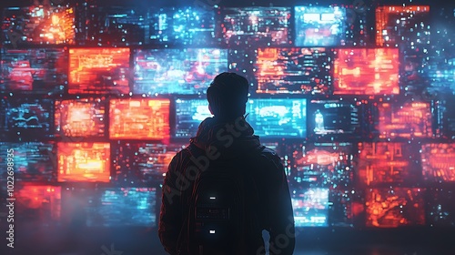 Hacker Silhouette in Front of Neon Data Wall