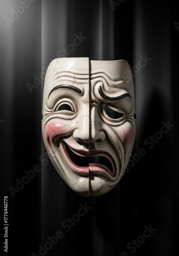 Half Face Mask Representing Joy and Sadness Against Dark Curtain Background