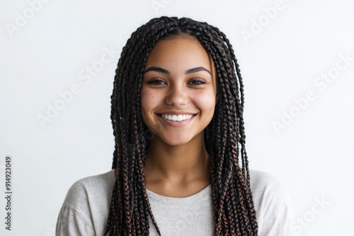 Half-body portrait of a young beautiful woman with boho braids, smiling on a white studio background.