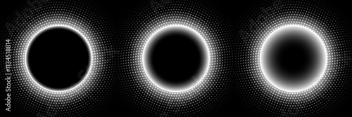 Halftone buttons, dots pattern black and white background.