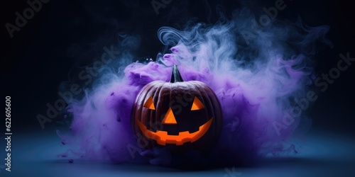 Halloween concept - pumpkin with a scary luminous face in smoke and neon light background, dark, Copy space, generative ai