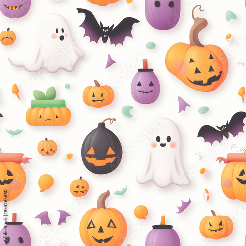 Halloween design featuring ghosts, pumpkins, and bats on a white background