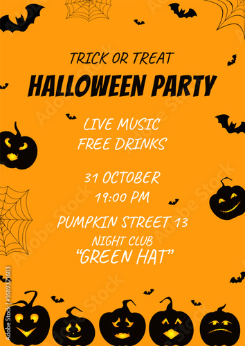 Halloween invitation with silhouettes of pumpkins with illuminated cut-out facial expressions, bats and spider webs on orange background. Template for flyer, post, social network, advertising