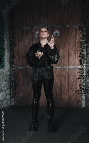 halloween make up. scary man ready for party. vampire guy with black eyes and tears in a black silk shirt with a frill.