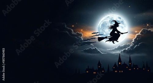 Halloween Witch Flying on Broomstick Under Full Moon Spooky Castle Night Sky Illustration