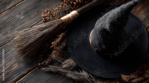Halloween Witch Hat and Broom Flatlay on Rustic Dark Wood