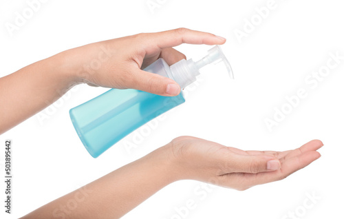 hand apply feminine wash Female sanitary gel in bottle with pump cap and dispenser isolated on white background.