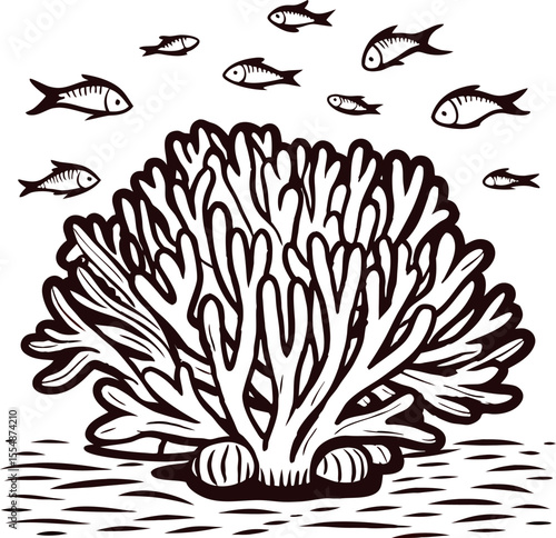 Hand drawn coral reef with fish swimming above and detailed ocean floor vintage engraved marine illustration