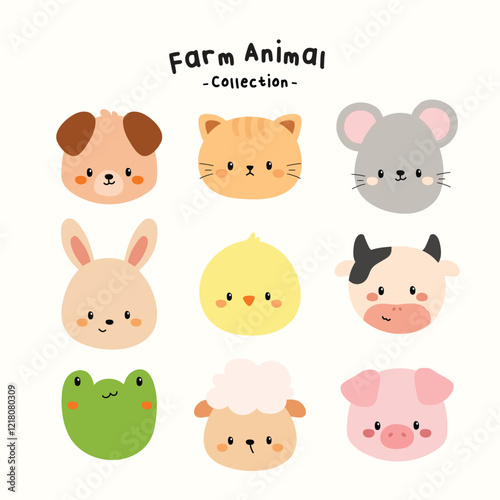 Hand Drawn Cute Farm Animal Faces Collection