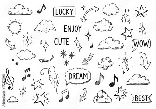 Hand drawn doodle elements featuring clouds stars music notes and words