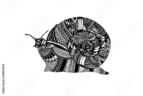 Hand drawn doodle vector outline snail illustration decorated with abstract ornaments. Abstract mobochrome drawing